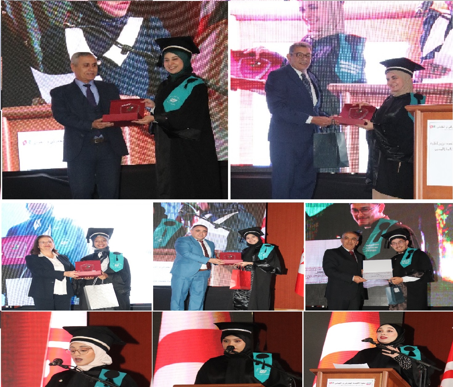 Ont pris part à cette cérémonie, Monsieur le Directeur Général des Impôts, représentant de Monsieur le Ministre des Finances , Monsieur le chargé des affaires de l’Ambassade de la République Tunisienne en Algérie, Monsieur l’Inspecteur Général de la Wilaya de Tipaza, représentant de Monsieur le Wali, Madame la Présidente du Conseil d’Administration de l’Institut et les Membres du Conseil d’Administration, les Hauts Fonctionnaires des Ministères des Finances algérien et tunisien, les Représentants des Autorités Locales Civiles et de Sécurité de la wilaya de Tipaza, Messieurs les PDG de certaines Compagnies d’Assurances, les représentants des Directeurs Généraux des Banques, les représentants des Présidents Directeurs Généraux des autres Compagnies d’Assurances, les Directeurs des Écoles Supérieures et des Universités, le corps professoral de l’Institut ainsi que les familles des diplômés de cette promotion. La cérémonie a débuté par les hymnes nationaux des deux pays partenaires l’Algérie et la Tunisie, suivie du discours d’ouverture prononcé par Monsieur le Directeur de l’Institut, qui a souhaité la bienvenue à l’ensemble des participants et invités, tout en saluant les efforts des étudiants et des équipes pédagogiques. Un message de Monsieur le Ministre des Finances, lu par son représentant à la cérémonie, a ensuite été adressé à l’assistance soulignant que l’Institut constitue un véritable levier stratégique pour la formation des cadres des ministères des deux pays, contribuant ainsi au renforcement des compétences et à la coopération institutionnelle. À cette occasion, l’Institut a rendu un hommage émouvant à Monsieur MERAR Imed, ancien cadre de l’IEDF chargé de la cellule informatique, en convalescence de longue durée. Accompagné de son fils, il a reçu une distinction honorifique en reconnaissance de son dévouement et de ses bons et loyaux services. Ce geste symbolique traduit la volonté de l’Institut de valoriser l’engagement humain et professionnel de ses cadres et de préserver la culture de reconnaissance et de respect au sein de l’institut.